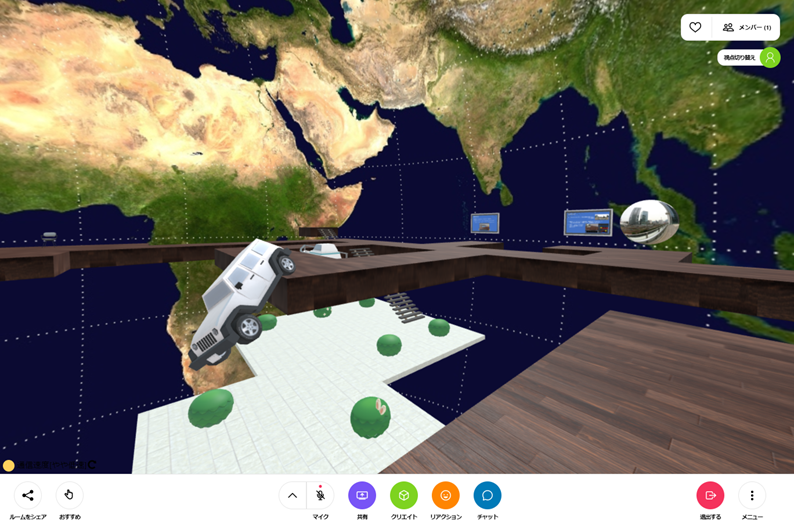 メタバース空間では、リアルの教室と同じように室内を動き回ったり、話したい人に近づいていき会話することができます。一方、リアルの教室ではポスターの展示や模型を置くなど、スペースや機材の制約から画一的な展示方法になりがちなところを、メタバース空間では動画を壁面に張り付けたり教室に持ち込めないような大きなものを持ち込んだり、物理法則を無視して物体を宙に浮かせたりなど、自由に表現することができます。リアル空間では不可能なことが、メタバース空間では可能になるわけです。