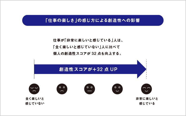 本研究のアンケート調査において、「仕事の楽しさ」について、「全く楽しいと感じていない」から「非常に楽しいと感じている」の5段階で回答してもらい、その結果からモデル分析※2を実施。すると、「仕事を楽しいと感じている」ことが非常に強く個人の創造性にプラスの影響を与えることがわかった。具体的には、「全く楽しいと感じていない」人の創造性を基準とした場合、「非常に楽しいと感じている」人の創造性のスコアは、100点満点中32点もプラスになる。すべての回答者の創造性スコアの平均点は66点であることからも、いかに「仕事の楽しさ」が創造性に与える影響が大きいかが理解できる。