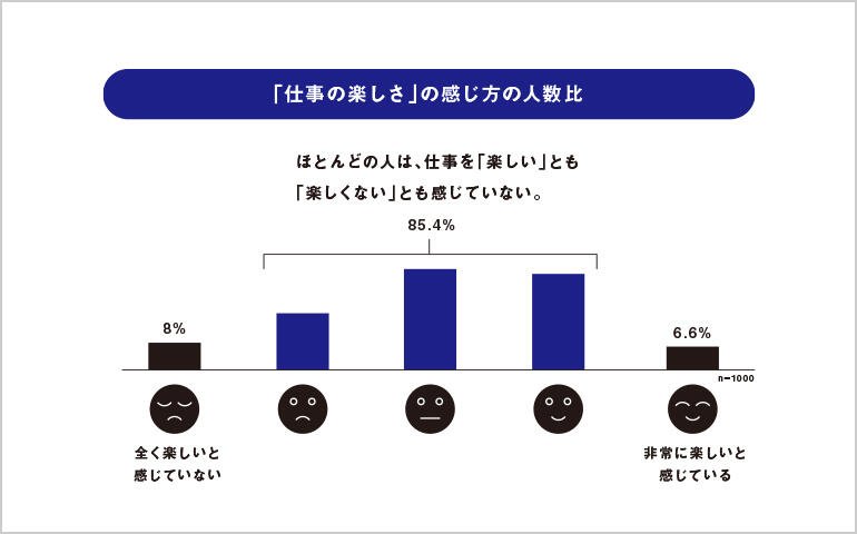 しかしながら、「仕事の楽しさ」について、「非常に楽しい」と回答した人は、全体の6.6%しか存在しておらず、「全く楽しいと感じていない」人も8%にとどまった。つまり、ほとんどの人が仕事を「楽しい」とも「楽しくない」ともいえず、そもそも仕事に対して楽しむという価値観を持っていない状態にあることがみてとれる。したがって、一人ひとりの個人が様々な局面で、「自分から、仕事を楽しむ」のだという価値観をもち、そのような姿勢で仕事に臨むことが、組織の創造性を向上させる第一歩であるといえる。