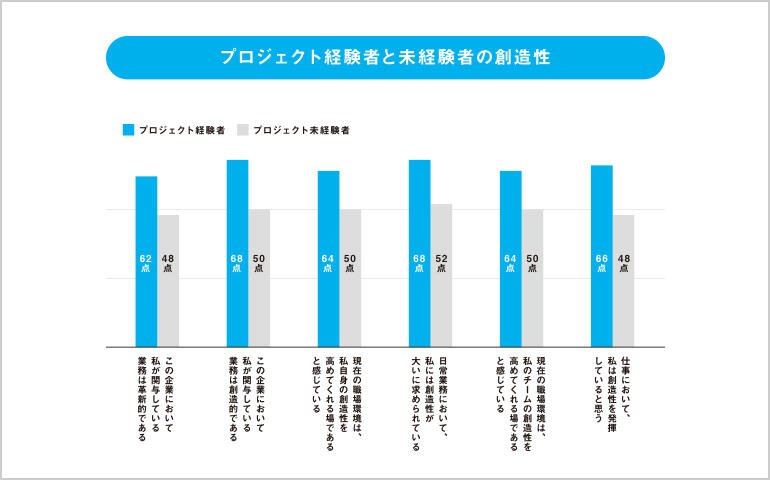 アンケート調査では、個人の創造性に関する評価を6つの設問に対して回答してもらったところ、すべてにおいて、「プロジェクト経験者」と「プロジェクト未経験者」では大きな差があることがわかった。また、創造性スコア(100点満点)の平均点を比較すると、プロジェクト経験者の方が16点も高い結果となった。いくつか考えられる理由はあるが、おそらくその一つは、プロジェクト型の仕事では、ゴールやタスク、役割がメンバーの一人ひとりに明確にセットされるため、個人の責任感や主体性が強くなることが考えられる。また、ひとりで業務を遂行するよりも、メンバー同士のインタラクションが創造性に寄与することが想定される。