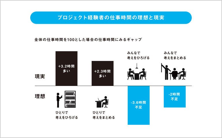 プロジェクトでの仕事を経験したことがある人は、未経験者に比べて、個人の創造性が高くなっている。一方、プロジェクト経験者においても、実際の業務の中では個人ワークが多く、みんなで考えを広げ・まとめる時間を確保したいという理想とのギャップが認められる。