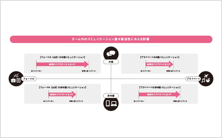 フォーマルかプライベートか、対面か非対面かを問わず、すべてのコミュニケーションはチームの創造性を高める。とりわけ、直接顔をあわせて仕事の話をする「フォーマルな対面コミュニケーション」や、チャットやメールでランチの約束をするような「プライベートな非対面コミュニケーション」が大きな効果を持つ。