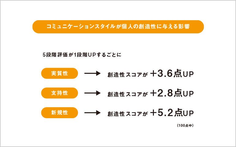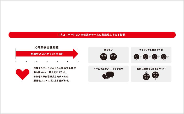 チームにおける「心理的安全性」は、チームの創造性に極めて大きなインパクトを与えていた。心理的安全性とは、不安や恐れを感じることなく、気兼ねなく発言や質問ができる状態や雰囲気のことである。アンケート調査では、心理的安全性指標を7段階で評価しており、心理的安全性が最も低い1の場合と最も高い7の場合を比較すると、チームの創造性スコアが約52点も異なる計算となる。特に、「安心してリスクをとることができる」「スキルと才能が尊重され役に立っている」という要素は創造性を高めていた。また、別の質問でチームの状況を取得してモデル分析を行ったところ、「チームメンバー同士は仲が良い」「自分が入手した情報やアイディアを素早くチームメンバーと共有している」「チームメンバーはすぐに有益なフィードバックをしてくれる」「性別に関係なく発言しやすい空気である」の4つが、創造性に有意にプラスの影響を与えていた。これらを意識して、チームメンバー同士を尊重しあい、気軽に何でも論じあう環境や関係性を構築することがチームの創造性を高めることにつながるといえる。