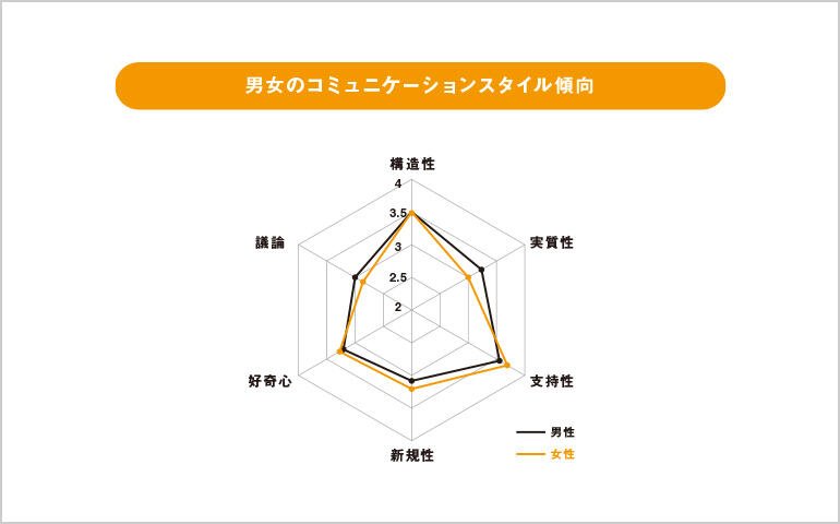 コミュニケーションスタイルには、「構造性」「実質性」「支持性」「新規性」「好奇心」「議論」の6つがある。アンケート調査において、それぞれを5段階評価した結果から、男女の傾向の違いを見たのが上のレーダーチャートである。男性は「実質性」「議論」、女性は「支持性」「新規性」「好奇心」が高く、会話の「構造性」は男女共にほぼ同じ値であることが分かる。つまり、女性はコミュニケーションにおいて共感と関連する指標が高く会話の幅を広げる傾向がみられる。他方、男性は実質的なコミュニケーションを得意とするといえる。