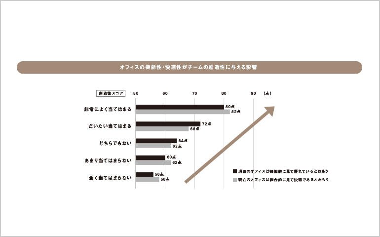 本研究では、創造性とオフィス空間の関係について調べるために、オフィスの総合的な満足度に寄与していることが知られている「機能性」と「快適性」に着目し、その状況についてアンケート調査を行った。上図は今回実施のアンケート回答者が、現在のオフィスの機能性・快適性を5段階で評価した結果と、自身が所属するチームの創造性スコア(100点満点)とのクロス集計である。その結果、快適性・機能性の評価が高いオフィスに在籍する人ほど創造性スコアも高い傾向が得られた。オフィス空間の機能性・快適性と創造性の明らかな相関関係がみられる要因には、オフィス空間がチーム内のコミュニケーションや内的なモチベーションに寄与するためとも考えられる。したがって、個人のモチベーションを高め、多様な人との交流を促す空間作りをすることが、創造的な組織を生み出すためますます重要になっていくものと期待される。