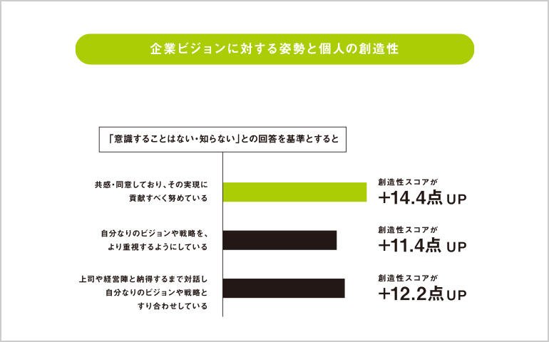 個人の創造性に関するモデル分析では、企業のビジョンに対して「意識することはない・知らない」と回答した人に比べ、その他の姿勢や態度をもつ人の方が創造性が有意に高いという結果となった。特に高くなるのは「共感・同意している」場合であり、「意識することはない・知らない」場合に比べ、創造性スコアがおよそ14点ほど高くなる。つまり、経営者が企業の創造性を向上させるには、多くの社員が共感できる企業理念・ビジョンを作ると同時に、それを社員に周知し、常に社員が意識するような状況にすることが効果的といえる。