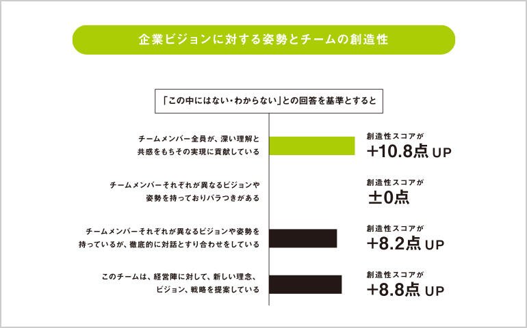 チームの創造性に関するモデル分析でも、企業のビジョンに対する姿勢について「この中にはない・わからない」と回答したチームに比べ、「チームメンバーが異なるビジョンや姿勢を持っておりバラつきがある」を除く、その他のチームの方が、創造性が有意に高いという結果になった。特に高くなるのが「チームメンバー全員が共感している」場合であり、「この中にはない・わからない」場合に比べて創造性スコアがおよそ10点ほど高くなる結果となった。ただし、「各メンバーが異なるビジョンを持っているが対話とすり合わせをしている」場合でも創造性は比較的高かったことから、各々が別のビジョンを持っていても、チーム内で徹底的に対話とすり合わせをすれば、十分な創造性を発揮できるといえる。