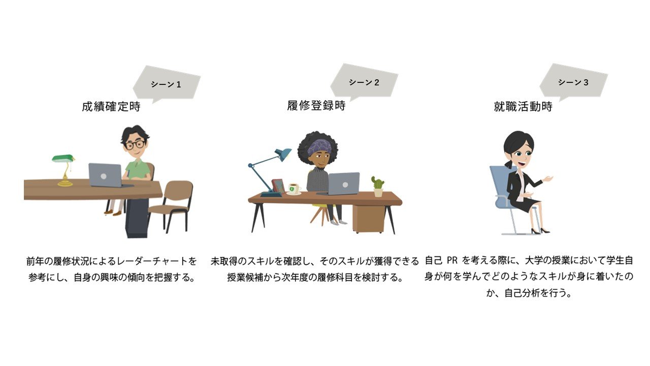 シーン③ 就職活動時に、大学の授業で何を学びどのようなスキルが身に着いたかをレーダーチャートを参考に確認する。自身の身に着いたスキルや興味がある分野を理解し、企業選びや面接時に活用する。