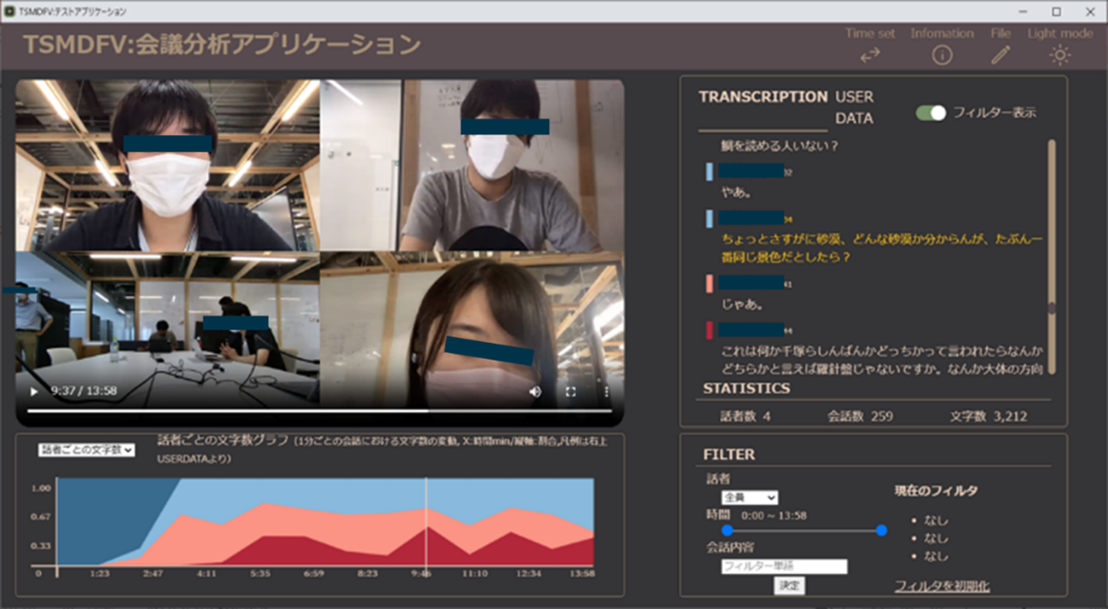 また、アイデア出しの振り返りや、グループワークの評価を行う仕組みとして「会議分析アプリ」を開発し、展示いたしました。「会議分析アプリ」は、武蔵野大学データサイエンス学部と共同研究・開発しているアプリケーションで、グループワークの話者ごとの発話量や、話題の発散度・収束度等を分析、表示します。これにより、教員は学生のグループワークの内容を俯瞰し、評価の参考にしたり、学生自身もグループワークでの発言や、アイデアを振り返り次回に活かすことができます。