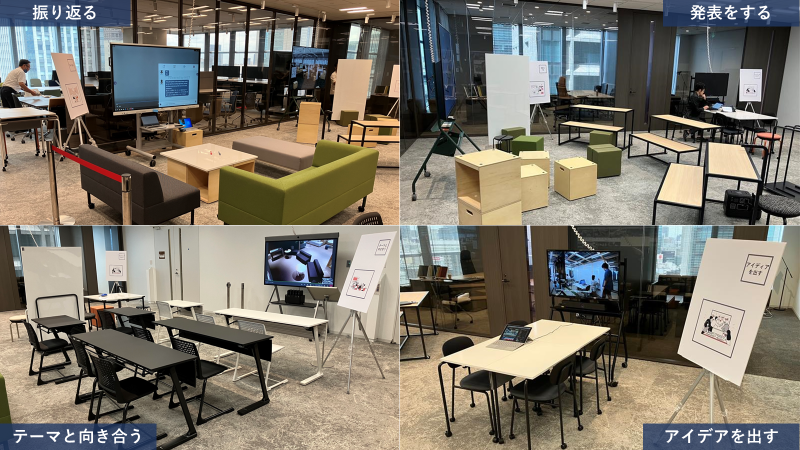 移動式のディスプレイや移動式のデスク・チェアを活用し、学生が自由にレイアウトを選択、テーマに合わせたスタイルの選択を可能とする空間をご提案いたしました。