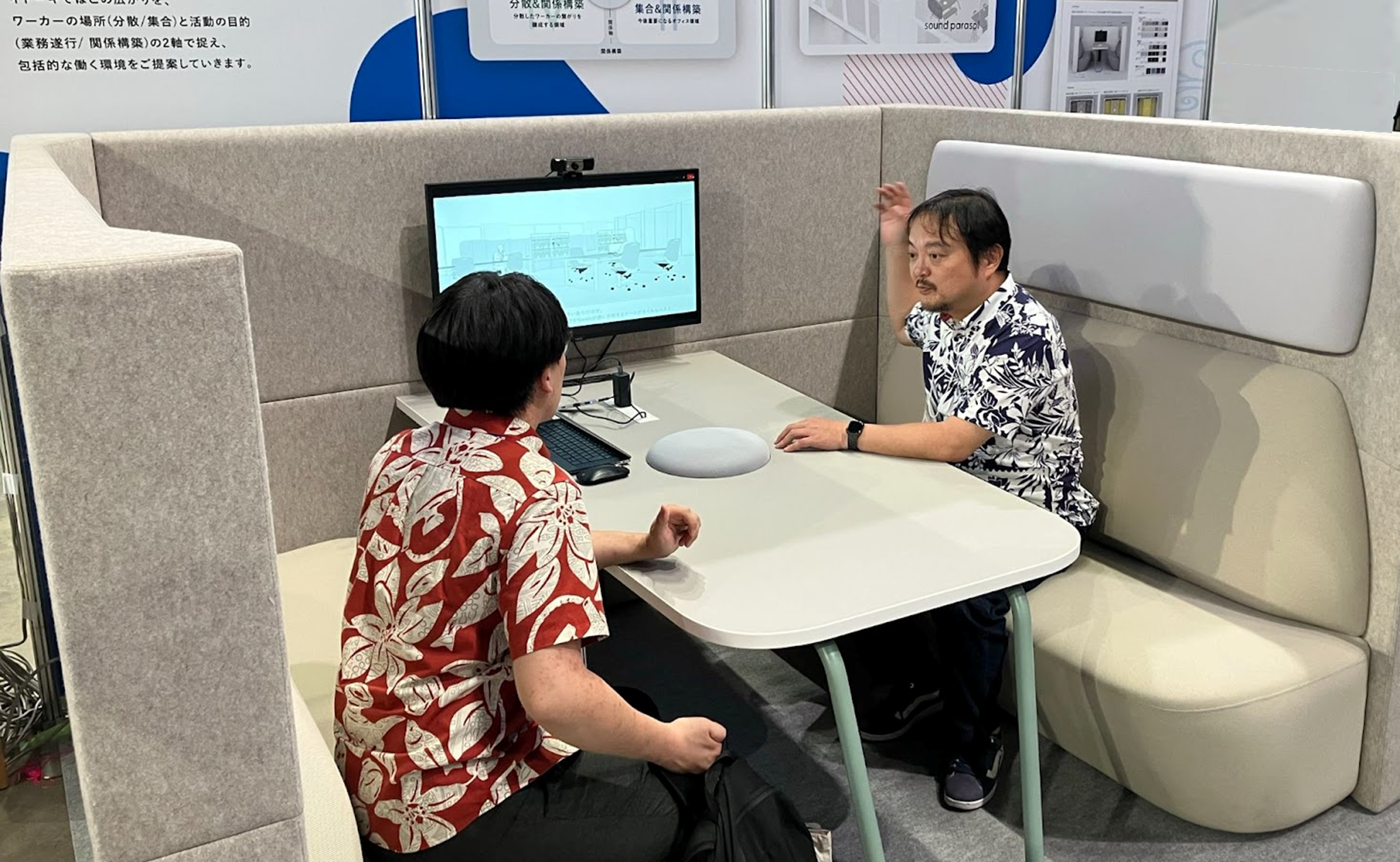 騒がしい会場内でも指向性スピーカーと指向性マイクによりsound sofa(サウンドソファ)を利用している人とリモート側の双方に適切にWeb会議の音声を届けることができます。