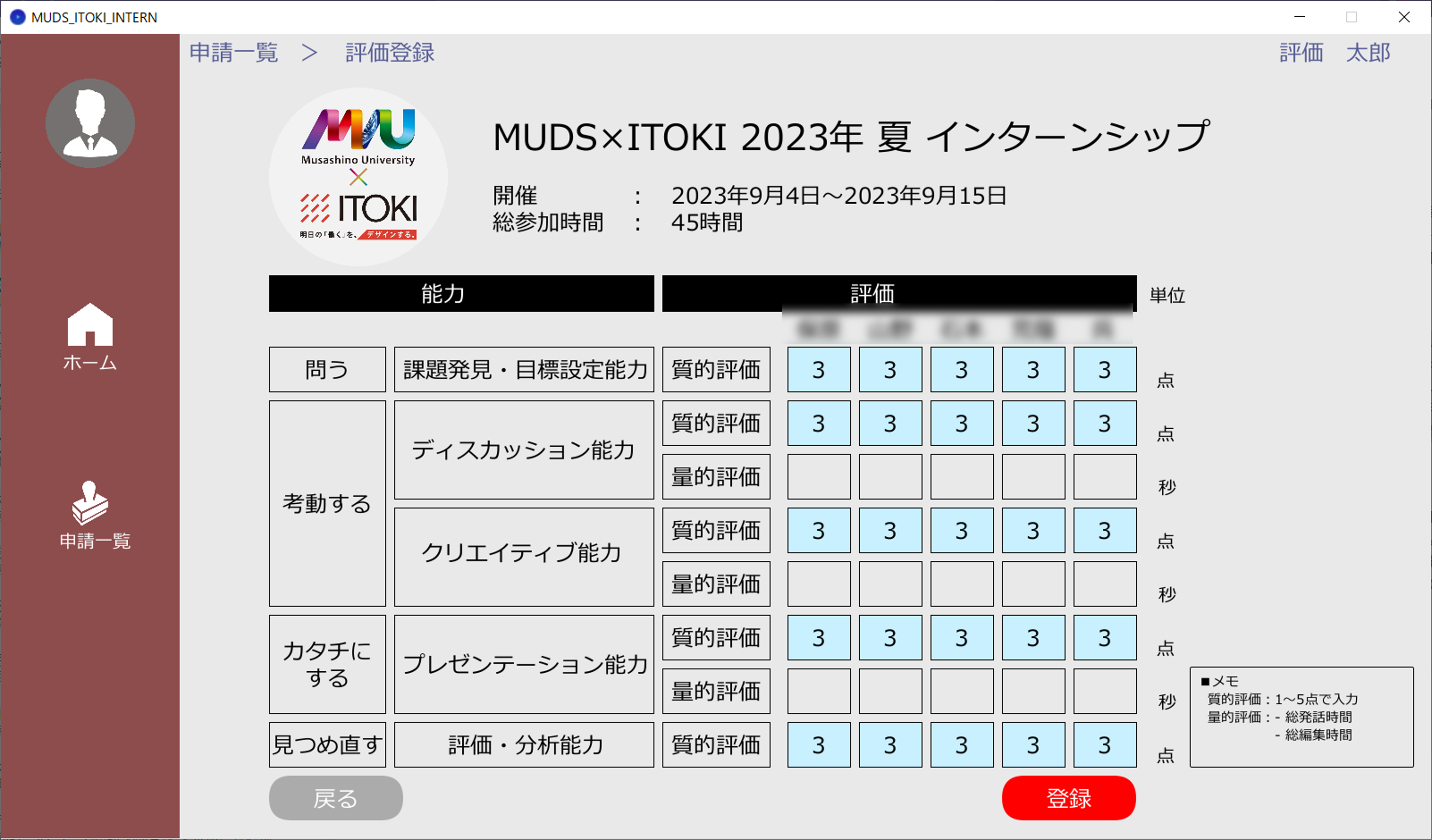 学習成果証明システムを活用することで、質的評価と量的評価の両軸で非認知能力の評価が可能となります。質的評価は、学生間の他己評価と教員やイトーキメンバーによる管理者評価から算定し、量的評価は、学生の発話時間や授業中の作業時間を記録し自動集計しました。評価項目は、武蔵野大学独自の学びのサイクルである「響学スパイラル」に基づき、課題発見・目標設定能力、ディスカッション能力、クリエイティブ能力、プレゼンテーション能力、評価・分析能力の5つとしました