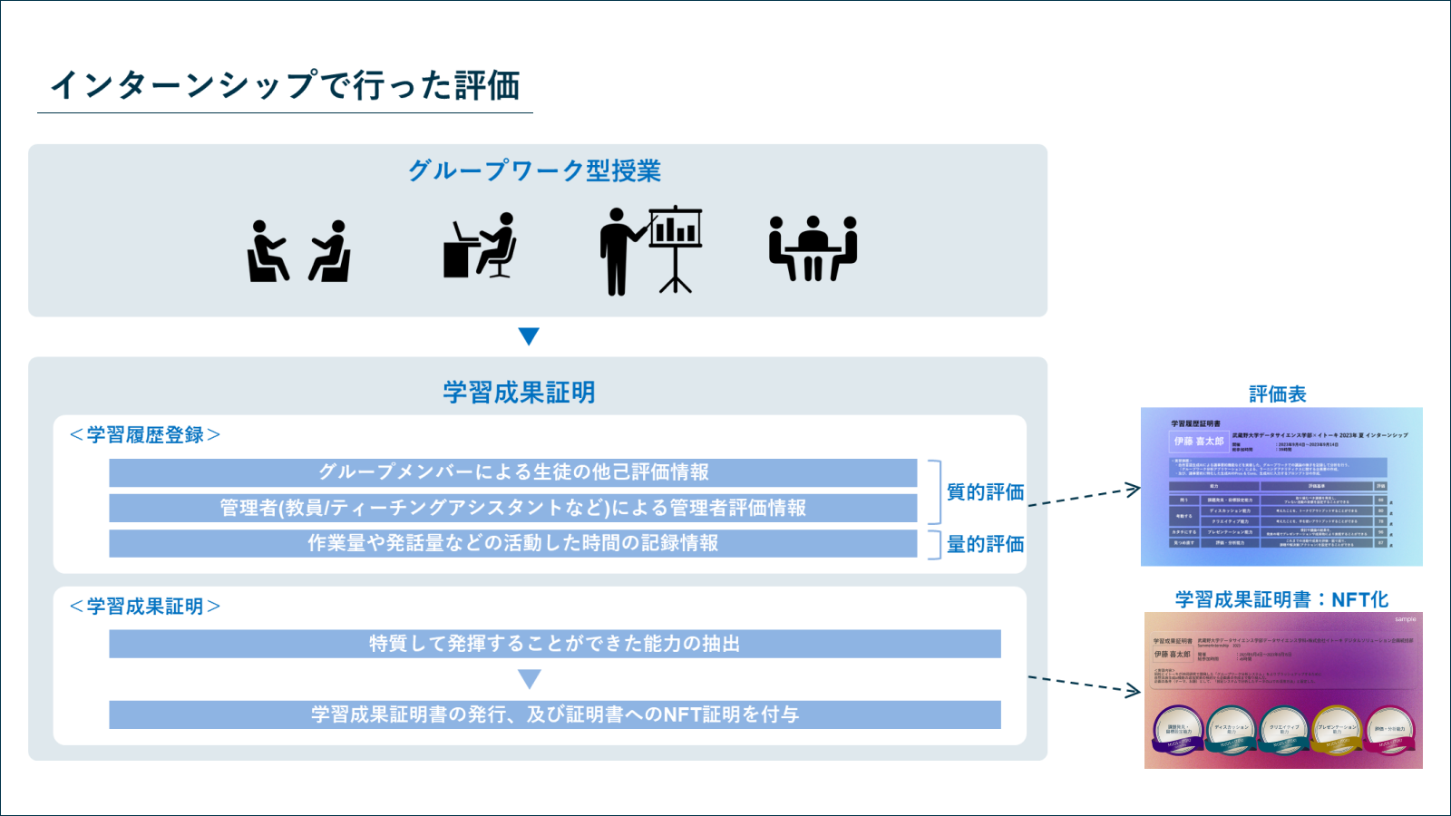 2023年9月4日(月)~15日(金)に武蔵野大学データサイエンス学部中西 崇文准教授、岡田 龍太郎助教とインターンシッププログラムとして産学連携授業を同学部で実施し、ディスカッション能力やプレゼンテーション能力、分析能力といった定量的に図りにくい非認知能力を、同学と共同開発した学習成果証明システムを利用し評価しました。また、その評価を証明する学習成果証明書をNFTにて12月14日(木)に共同発行しました。これにより、就職活動やインターンシップ活動で必須とされている「学チカ」すなわち「学生時代に力を入れたこと」を始め、学生がアピールしづらかった客観的な自身の非認知能力を、外部へ証明することができます。