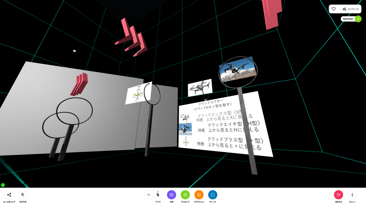今回活動に参加した10名の有志生徒は、8チームに分かれてApple Pencilを対象としたデジタルツールの身体性の検証や、ドローンの形状比較、ミニ四駆の設計検証、ボードゲームの新たなルールの検討などをテーマに研究を進め、それぞれ研究結果をメタバース空間内で表現しました。