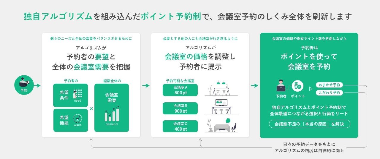 「Reserve Any」の特徴は、会議室の「ポイント予約制」です。これは、会議室の予約状況に応じて会議室の価格(利用ポイント)が日々変動することで、予約者は保有ポイントを考慮しながら会議室を予約する仕組みです。例えば、需要の多い時間帯や人気の会議室は利用ポイントを高く設定することで、需要が少ない時間帯や会議室の選択を予約者に促します。会議室の価格を意識することで全体最適に望ましいふるまいが誘発され、必要度の高い予約者の希望する会議室の利用が可能になります。