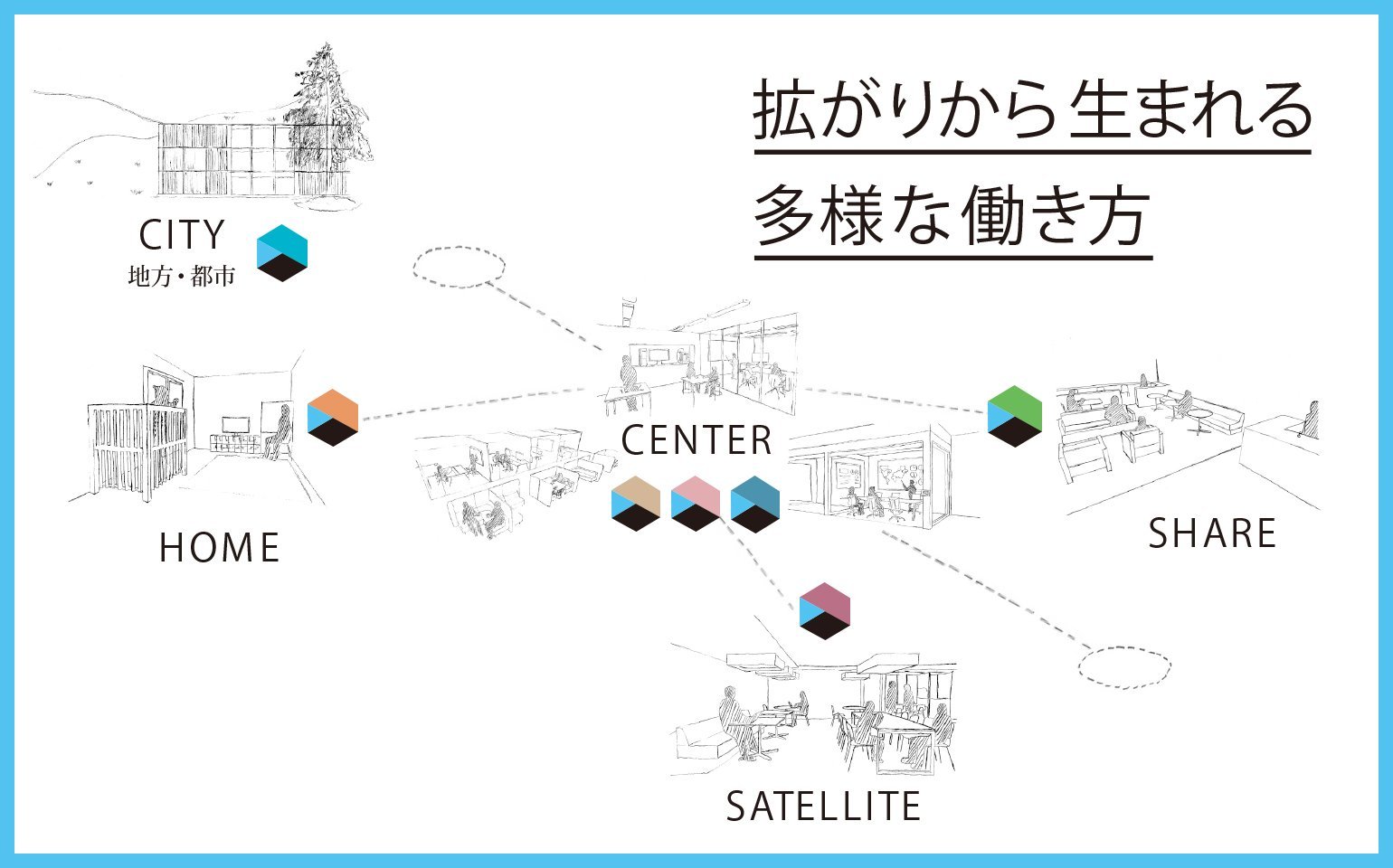 人と企業の関係を拡張すると、時間、場所だけにとどまらず、行動やこころも拡がっていく。拡がりにおいて、どのような働き方をするか、創造的に考えることで、豊かな体験を伴った新しい価値が生まれます。働く場所はオフィスだけではありません。家、街、学校など拡がる時間と場所のなかで生 まれる出来事を持続的な働き方の体験価値としてデザインすることが大切です。