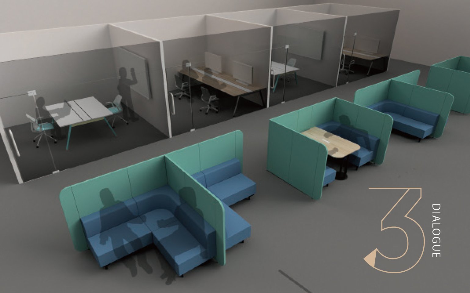 知識欲が高くてなんでも質問してくる若手と、部員一人ひとりに常に気を配っている部長。そんな二人がなにやら熱く語り合っている。最初は静かだったスペースから徐々に声がこぼれはじめ、社内のみんなに二人の熱量が届くまでになった。どうやらより熱っぽく語っているのは部長の方のようだ。対話の内容からすると、自分は役立ちそうな情報を持っている。二人の議論に混じることにしよう。