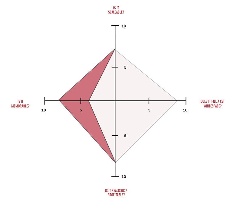 生れたばかりのアイデアをさらに絞り込み凝縮させるため、そのアイデアに対する検討基準を4項目、設定する。各アイデアが基準を満たすかどうかについて、1(あまり満たさない)-10(完全に満たしている)の数値でグラフに表示。足りない部分については改善案を追加する。
