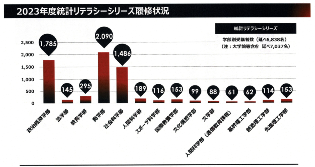 野村亮(以下、野村) まだまだ足りないものの、この6年で科目を必修にする学部は増加傾向にあり、手応えは感じています。必修科目に指定されると一気に履修者が増えるわけで、例えば政治経済学部や商学部、社会科学部の履修者の多さはそうした背景によるものです(図3)。